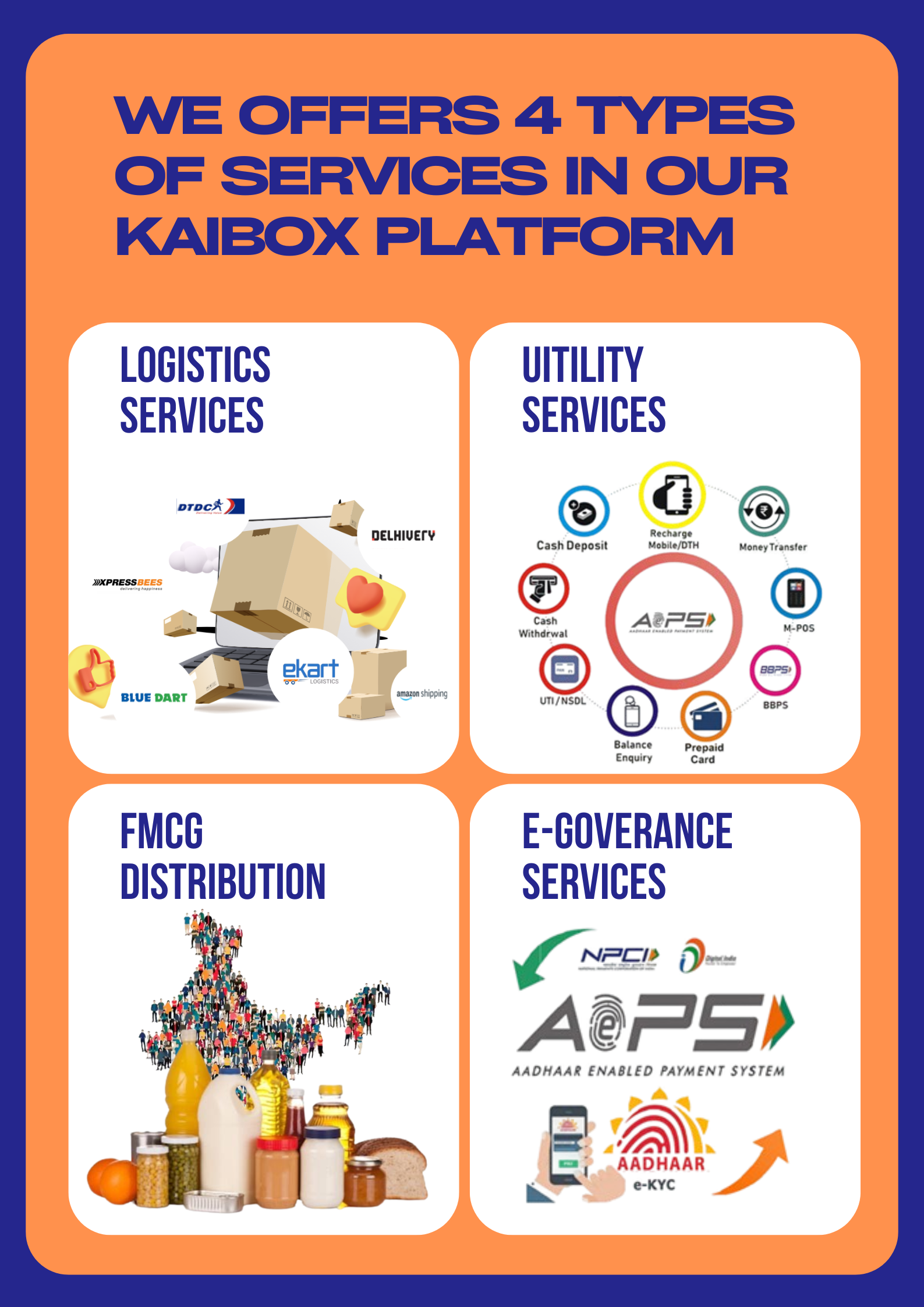 Kaibox is a technology-enabled, partner-led platform built to strengthen India’s delivery and utility infrastructure at the local level. We integrate logistics, FMCG distribution, and essential utility services into a single, structured network that operates efficiently across districts, towns, and neighborhoods.